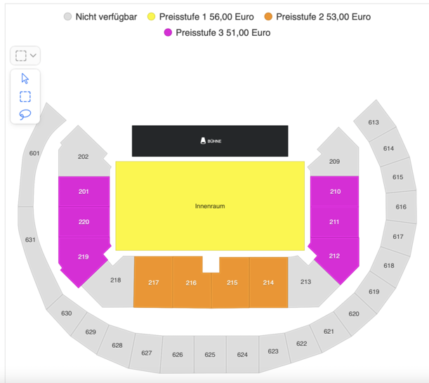 Oben links im Saalplan leuchtet eine blaue Maus. Wenn Sie auf diese Maus klicken, können Sie zwischen unterschiedlichen Auswahlmöglichkeiten wählen (siehe Foto).